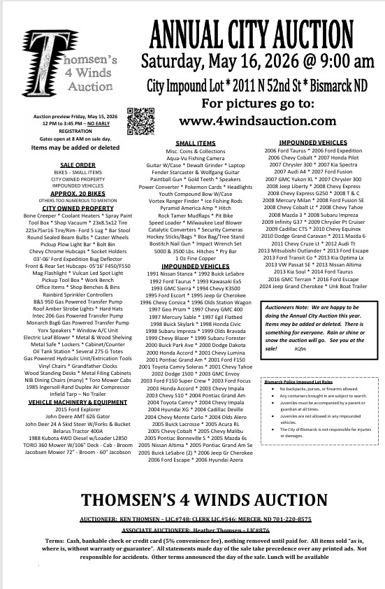 City of Bismarck Annual Spring Sale City of Bismarck Annual Sale May 16, 2026 Click here for Bismarck City Sale Bill